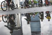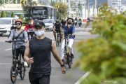 Warga bersepeda melintasi Jalan Jenderal Sudirman di Jakarta, Minggu (14/2/2021). Meski Pemprov DKI Jakarta menerapkan Pemberlakuan Pembatasan Kegiatan Masyarakat (PPKM) berbasis mikro, namun warga masih ramai berolahraga di jalan protokol ibukota. ANTARA FOTO/M Risyal Hidayat/wsj.