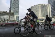 Warga bersepeda melintasi kawasan Bundaran Hotel Indonesia di Jakarta, Minggu (14/2/2021). Meski Pemprov DKI Jakarta menerapkan Pemberlakuan Pembatasan Kegiatan Masyarakat (PPKM) berbasis mikro, namun warga masih ramai berolahraga di jalan protokol ibukota. ANTARA FOTO/M Risyal Hidayat/wsj.