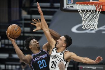 Pebasket Sacramento Kings Hassan Whiteside (kiri) berupaya memasukkan bola ke dalam ring lawan yang dijaga pebasket Brooklyn Nets Landry Shamet (kanan) dalam laga lanjutan NBA, di Golden 1 Center, Sacramento, California, Amerika Serikat, Senin (15/2/2021. Nets berhasli mengalahkan Kings 136 - 125 . ANTARA FOTO/Reuters-Kyle Terada-USA TODAY Sports/hp.