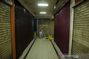 Karyawan membersihkan selasar di antara kios pakaian yang tutup di Pasar Baru Trade Center, Bandung, Jawa Barat, Rabu (17/2/2021). Himpunan Pedagang Pasar Baru (HP2B) Kota Bandung mengatakan sedikitnya 60 persen dari lima ribuan pedagang yang biasa memasarkan busana muslim, oleh-oleh haji dan seragam sekolah di Pasar tersebut terpaksa menutup usahanya dan merugi akibat pandemi COVID-19. ANTARA FOTO/Novrian Arbi/rwa.