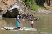 Warga yang menjemput anaknya menaiki rakit bambu saat menyeberangi sungai usai pulang sekolah di Desa Siron Krueng, Kecamatan Kuta Cot Glee, Kabupaten Aceh Besar, Aceh, Rabu (17/2/2021). Meski membahayakan keselamatan, warga setempat harus menggunakan rakit tersebut akibat belum diperbaikinya jembatan gantung yang rusak akibat diterjang banjir sekitar lima tahun lalu ANTARA FOTO/Ampelsa/hp.