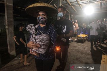 Sejumlah keluarga duka melakukan prosesi ritual adat Tantulak Ambun Rutas Matei, di Palangkaraya, Kalimantan Tengah, Rabu (17/2/2021) malam. Ritual tersebut dilakukan oleh masyarakat adat Dayak Ngaju Kaharingan Kalteng bertujuan untuk mengantarkan arwah yang sudah meninggal ke tempat penantian sementara di Lewu Bukit Nalian Lanting (dekat dengan surga) sekaligus membersihkan keluarga duka dari penyakit serta terhindar dari mara bahaya. ANTARA FOTO/Makna Zaezar/pras.