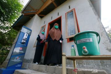 Petugas Puskesmas bersiaga di rumah yang dijadikan ruang isolasi mandiri di Desa Talulobutu, Tapa, Kabupaten Bone Bolango, Gorontalo, Kamis (18/2/2021). Pemerintah Desa setempat menyiapkan satu unit rumah untuk isolasi, perawatan, pengamanan hingga kebutuhan sehari-hari bagi warganya yang terjangkit COVID-19 dengan mengalokasikan Dana Desa. ANTARA FOTO/Adiwinata Solihin/pras.