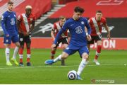 Pesepak bola Chelsea Mason Mount (kanan) menendang bola dari titik penalti dan membuat gol ke gawang Southampton dalam laga lanjutan Liga Inggris, di Stadion St Mary's, Southampton, Inggris, Sabtu (20/2/2021). Southampton menahan Chelsea 1-1 dalam pertandingan ini. ANTARA FOTO/Pool via Reuters-Neil Hall/hp.
