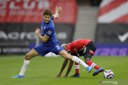 Pesepak bola ChelseaMarcos Alonso (kiri) berebut bola dengan pesepak bola Southampton Moussa Djenepo (kanan) dalam laga lanjutan Liga Inggris, di Stadion St Mary's, Southampton, Inggris, Sabtu (20/2/2021). Southampton menahan Chelsea 1-1 dalam pertandingan ini. ANTARA FOTO/Pool via Reuters-Kirsty Wigglesworth /hp.