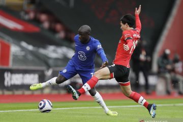 Pesepak bola Chelsea N'Golo Kante (kiri) berebut bola dengan pesepak bola Southampton Takumi Minamino (kanan) dalam laga lanjutan Liga Inggris, di Stadion St Mary's, Southampton, Inggris, Sabtu (20/2/2021). Southampton menahan Chelsea 1-1 dalam pertandingan ini. ANTARA FOTO/Pool via Reuters-Kirsty Wigglesworth /hp.