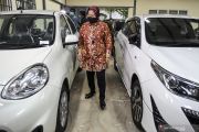 Menteri Sosial Tri Rismaharini mengamati sejumlah mobil yang merupakan barang undian di salah satu gudang Kemensos di Jakarta, Selasa (23/2/2021). Kemensos akan melelang barang hasil undian yang tak tertebak dan undian yang tak ditebus berupa sembilan mobil, 27 sepeda motor hingga 50 batang emas yang kemudian hasil lelang akan digunakan kepentingan dana bencana. ANTARA FOTO/M Risyal Hidayat/hp.