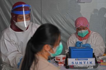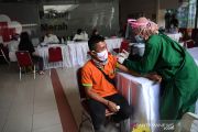 Petugas kesehatan menyuntikkan vaksin COVID-19 kepada pedagang di Blok A Pasar Tanah Abang Jakarta, Kamis (25/2/2021). Kementerian Kesehatan memperpanjang periode vaksinasi COVID-19 pedagang di Pasar Tanah Abang hingga 2 Maret 2021 karena masih tingginya animo pedagang yang ingin divaksin mencapai 21.250 orang. ANTARA FOTO/Wahyu Putro A/aww.
