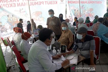 Petugas medis memeriksa kesehatan penerima vaksin COVID-19 untuk pedagang saat vaksinasi di Pasar Klewer, Solo, Jawa Tengah, Sabtu (27/2/2021). Sebanyak 3.800 pedagang Pasar Klewer dan 680 pedagang Pasar Gede Solo mengikuti Vaksinasi COVID-19 bertajuk Kebut Vaksinasi Kebut Pemulihan Ekonomi tersebut. ANTARA FOTO/Maulana Surya/aww.