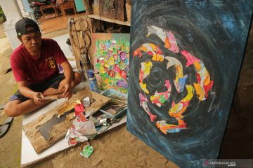 Samiaji menyelesaikan pembuatan lukisan dari sampah plastik di Desa Banjarsari, Kabupaten Jombang, Jawa Timur, Senin (1/3/2021). Samiaji memanfaatkan sampah plastik hingga memiliki nilai jual melalui karya seni dan dijual mulai harga Rp100 ribu hingga jutaan rupiah per lukisan tergantung tema serta tingkat kerumitan. ANTARA FOTO/Syaiful Arif/hp.