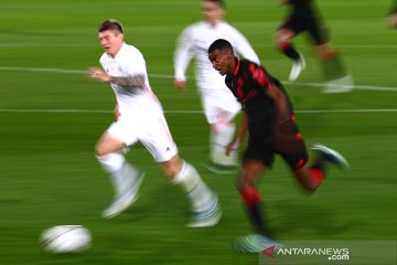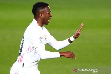 Pemain Real Madrid Vinicius Junior merayakan golnya ke gawang Real Sociedad saat laga Liga Spanyol di Estadio Alfredo Di Stefano, Madrid, Spanyol, (1/3/2021). Kedua tim bermain imbang 1-1. ANTARA FOTO/REUTERS/Sergio Perez/aww.