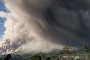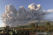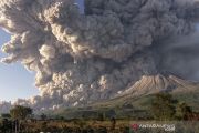 Gunung Sinabung menyemburkan material vulkanik saat erupsi di Desa Kuta Rakyat, Naman Teran, Karo, Sumatera Utara, Selasa (2/3/2021). Gunung Sinabung erupsi dengan tinggi kolom 5.000 meter di atas puncak. ANTARA FOTO/Sastrawan Ginting/aww.
