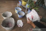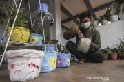 Perajin membuat pot dari limbah popok di Ecovillage Green Tirtajaya, Depok, Jawa Barat, Selasa (2/3/2021). Perajin tersebut memanfaatkan popok bekas menjadi pot bunga yang dijual dengan harga Rp20 ribu hingga Rp35 ribu per pot tergantung ukuran. ANTARA FOTO/Asprilla Dwi Adha/rwa.