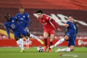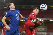 Pesepak bola Chelsea Cesar Azpilicueta (kiri) berebut bola dengan pesepak bola Liverpool Roberto Firmino (kanan) dalam laga lanjutan Liga Inggris, di Stadion Anfield, Liverpool, Inggris, Kamis (4/3/2021). Chelsea berhasil mengalahkan Liverpool 1-0 lewat gol yang dicetak Mason Mount pada menit ke-42. ANTARA FOTO/Pool via Reuters/Oli Scarff /hp.