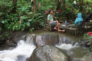 Pengunjung menikmati makanan dan minuman yang disajikan di Kafe Keceh, Jabung, Malang, Jawa Timur, Sabtu (6/3/2021). Perum Perhutani bekerja sama dengan pemuda Karang Taruna setempat mengubah kawasan hulu sungai Kalijahe di lereng Gunung Bromo tersebut menjadi kafe bernuansa alam guna memberdayakan masyarakat sekitar hutan sekaligus menambah Pendapatan Asli Desa (PADes). ANTARA FOTO/Ari Bowo Sucipto/wsj.