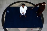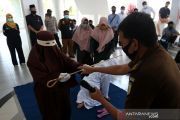Algoji (kiri) menyerahkan kembali rotan yang digunakan untuk mengeksekusi cambuk terpidana pelanggar peraturan daerah (qanun) nomor 6/2020 tentang hukum jinayat kepada petugas jaksa di Banda Aceh, Aceh, Senin (8/3/2021). Mahkamah Syariah, Kejaksaan Negeri dan Wilayatul Hisbah Kota Banda Aceh tetap melaksanakan prosesi eksekusi cambuk ditengah pandemi COVID-19 dengan memperketat protokol kesehatan. ANTARA FOTO / Irwansyah Putra/aww.