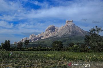 Gunung Sinabung menyemburkan material vulkanik saat erupsi di Desa Kuta Rakyat, Naman Teran, Karo, Sumatera Utara, Kamis (11/3/2021). Gunung Sinabung erupsi dengan tinggi kolom 3.000 meter di atas puncak. ANTARA FOTO/Sastrawan Ginting/aww.