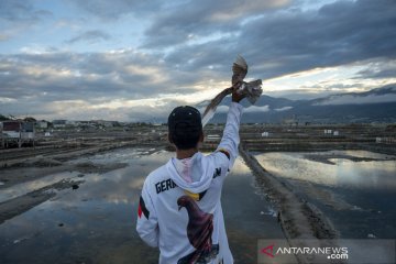 Sejumlah peserta melambaikan burung merpatinya pada Lomba Merpati Balap di Palu, Sulawesi Tengah, Minggu (14/3/2021). Lomba merpati balap yang digelar komunitas pecinta burung merpati dan mempertandingkan kelas utama 1.000 meter itu pertama kalinya digelar pasca aktivitas komunitas dibatasi akibat pandemi COVID-19. ANTARAFOTO/Basri Marzuki/rwa.