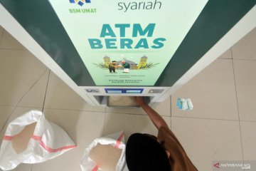 Warga menggunakan ATM beras di Masjid Agung Nurul Iman, Padang, Sumatera Barat, Selasa (16/3/2021). Masjid Agung Nurul Iman bekerja sama dengan Bank Syariah Indonesia (BSI) menyediakan ATM beras bagi 100 orang penerima, di antaranya fakir miskin, dhuafa, orang-orang terutang dan santri penghafal Al-Quran dengan jatah lima liter per orang per minggu. ANTARA FOTO/Iggoy el Fitra/foc.