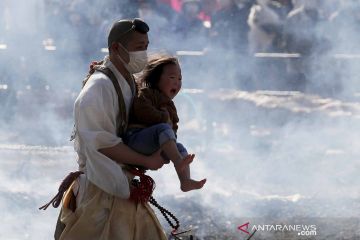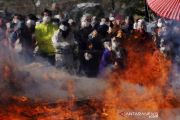 Sejumlah orang dengan memakai masker di wajahnya menonton Festival Berjalan di Api, yang disebut Hiwatari Matsuri dalam bahasa Jepang di Gunung Takao di Tokyo, Jepang, Minggu (14/3/2021). ANTARA FOTO/REUTERS/Kim Kyung-Hoon/wsj.