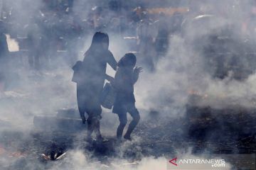 Seorang wanita dan anak perempuan berjalan melintasi tanah panas yang membara di Festival Berjalan di Api, yang disebut Hiwatari Matsuri dalam bahasa Jepang di Gunung Takao di Tokyo, Jepang, Minggu (14/3/2021). ANTARA FOTO/REUTERS/Kim Kyung-Hoon/wsj.