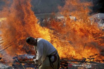 Seorang biksu menyalakan api di Festival Berjalan di Api, yang disebut Hiwatari Matsuri dalam bahasa Jepang di Gunung Takao di Tokyo, Jepang, Minggu (14/3/2021). ANTARA FOTO/REUTERS/Kim Kyung-Hoon/wsj.