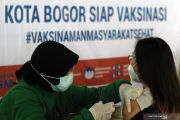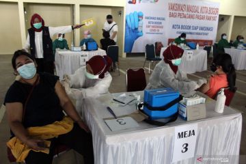 Petugas kesehatan menyuntikan vaksin COVID-19 ke pedagang pasar di area parkir Blok F, Pasar Kebon Kembang, Kota Bogor, Jawa Barat, Kamis (18/3/2021). Sebanyak 1.800 pedagang pasar di Kota Bogor mulai mengikuti vaksinasi COVID-19 tahap kedua dengan target sasaran penerima vaksin lebih dari 10 ribu pedagang sebagai upaya untuk memulihkan kondisi di sektor ekonomi. ANTARA FOTO/Arif Firmansyah/hp.