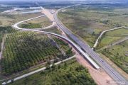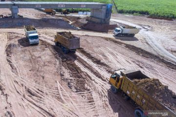 Foto udara pembangunan proyek jalan tol Trans Sumatera ruas Palembang-Bengkulu Seksi Indralaya-Prabumulih di Indralaya, Ogan Ilir (OI), Sumatera Selatan, Kamis (18/3/2021). Progres pembangunan Jalan Tol Palembang-Muaraenim ruas Indralaya-Prabumulih sepanjang 64,8Km tersebut sudah mencapai 30,4 persen dan ditargetkan rampung pada Semester II tahun 2022. ANTARA FOTO/Nova Wahyudi/hp.