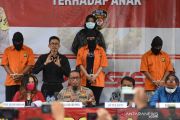 Kabid Humas Polda Metro Jaya Kombes Pol Yusri Yunus (kedua kiri) didampingi Ketua KPAI Susanto (kedua kanan) memberikan keterangan dalam gelar kasus prostitusi dan eksploitasi anak yang melibatkan tersangka artis Cynthiara Alona (tengah) di Ditreskrimum Polda Metro Jaya, Jakarta, Jumat (19/3/2021). Cynthiara Alona dihadirkan bersama dua tersangka lainnya dalam keterlibatannya sebagai pemilik hotel di Tangerang yang digunakan sebagai tempat prostitusi anak di bawah umur. ANTARA FOTO/Indrianto Eko Suwarso/aww.