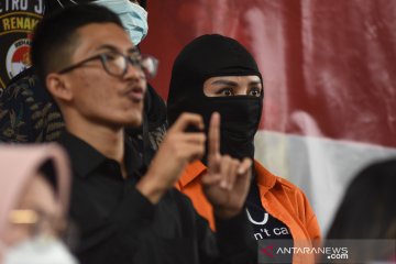 Tersangka artis Cynthiara Alona (tengah) dihadirkan dalam gelar kasus prostitusi dan eksploitasi anak di Ditreskrimum Polda Metro Jaya, Jakarta, Jumat (19/3/2021). Cynthiara Alona dihadirkan bersama dua tersangka lainnya dalam keterlibatannya sebagai pemilik hotel di Tangerang yang digunakan sebagai tempat prostitusi anak di bawah umur. ANTARA FOTO/Indrianto Eko Suwarso/aww.