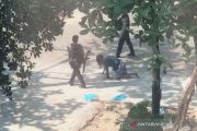 Seorang petugas polisi yang membawa senapan memaksa seorang pria merangkak di Yangon, Myanmar 19 Maret 2021 dalam gambar diam dari video yang diperoleh oleh Reuters. ANTARA FOTO/Stringer/aww.