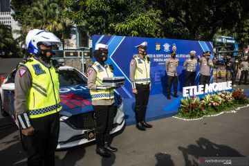 Polisi Lalu Lintas menunjukkan kamera Electric Traffic Law Enforcement (ETLE) Mobile yang terpasang saat peluncuran di Polda Metro Jaya, Jakarta, Sabtu (20/3/2021). Polda Metro Jaya meluncurkan 30 perangkat kamera ETLE Mobile yang terpasang di badan petugas (body cam), helm (helmet cam), dan dashboard mobil (dash cam). ANTARA FOTO/Aprillio Akbar/hp.