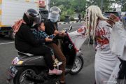 Anggota komunitas dengan kostum hantu menghibur wisatawan yang menaiki Bandung Tour on Bus (Bandros) di kawasan wisata bangunan bersejarah Jalan Asia Afrika, Bandung, Jawa Barat, Sabtu (20/3/2021). Dinas Kebudayaan dan Pariwisata Kota Bandung mencatat, pada 2020 jumlah kunjungan wisatawan domestik ke Kota Bandung turun sebanyak 50 persen atau hanya 3,2 juta wisatawan dibandingkan pada 2019 yang hampir menyentuh 7,5 juta orang. ANTARA FOTO/Raisan Al Farisi/hp.