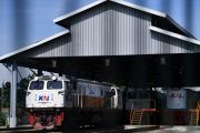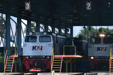 Pekerja berjalan di samping lokomotif di Depo Cipinang, Jakarta Timur, Minggu (21/3/2021). Kementerian Perhubungan menyatakan Depo Cipinang merupakan depo kereta api terbesar di Indonesia yang memiliki 28 jalur kereta, mampu merawat 144 lokomotif dan 120 gerbong kereta per hari serta dibangun di atas lahan seluas sembilan hektare dengan biaya hampir Rp500 miliar. ANTARA FOTO/Sigid Kurniawan/wsj.