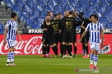 Pemain Barcelona merayakan gol ke gawang Real Sociedad dalam laga lanjutan Liga Spanyol di Reale Arena, San Sebastian, Spanyol, Minggu (21/3/2021). Barca menang telak 6-1 dalam laga itu. ANTARA FOTO/REUTERS/Vincent West/foc.