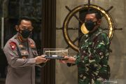 Kepala Staf TNI Angkatan Laut (KSAL) Laksamana TNI Yudo Margono (kanan) memberikan cinderamata kepada Kapolri Jenderal Pol Listyo Sigit Prabowo (kiri) saat kunjungan di Gedung Utama, Mabes TNI AL, Cilangkap, Jakarta, Senin (22/3/2021). KSAL menerima kunjungan Kapolri dalam rangka silahturahim usai dilantik oleh Presiden Joko Widodo sekaligus untuk memantapkan sinergitas dan mempererat soliditas antara TNI AL dan Polri. ANTARA FOTO/Asprilla Dwi Adha/wsj.