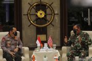 Kepala Staf TNI Angkatan Laut (KSAL) Laksamana TNI Yudo Margono (kanan) berbincang dengan Kapolri Jenderal Pol Listyo Sigit Prabowo (kiri) saat kunjungan di Gedung Utama, Mabes TNI AL, Cilangkap, Jakarta, Senin (22/3/2021). KSAL menerima kunjungan Kapolri dalam rangka silahturahim usai dilantik oleh Presiden Joko Widodo sekaligus untuk memantapkan sinergitas dan mempererat soliditas antara TNI AL dan Polri. ANTARA FOTO/Asprilla Dwi Adha/wsj.