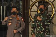 Kepala Staf TNI Angkatan Laut (KSAL) Laksamana TNI Yudo Margono (kanan) bersama Kapolri Jenderal Pol Listyo Sigit Prabowo (kiri) melakukan salam komando saat kunjungan di Gedung Utama, Mabes TNI AL, Cilangkap, Jakarta, Senin (22/3/2021). KSAL menerima kunjungan Kapolri dalam rangka silahturahim usai dilantik oleh Presiden Joko Widodo sekaligus untuk memantapkan sinergitas dan mempererat soliditas antara TNI AL dan Polri. ANTARA FOTO/Asprilla Dwi Adha/wsj.