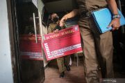 Petugas membawa papan penyegelan saat penutupan hotel tempat prostitusi daring di Larangan, Kota Tangerang, Banten, Senin (22/3/2021). Hotel tersebut ditutup akibat ditemukannya praktik prostitusi daring lewat aplikasi yang melibatkan anak di bawah umur. ANTARA FOTO/Fauzan/wsj.
