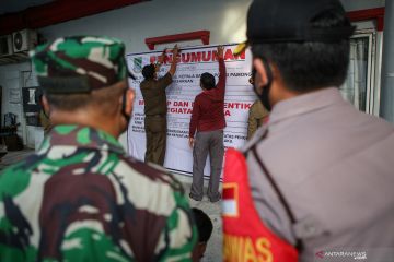 Petugas memasang pemberitahuan penyegelan hotel tempat prostitusi daring, di Larangan, Kota Tangerang, Banten, Senin (22/3/2021). Hotel tersebut ditutup akibat ditemukannya praktik prostitusi daring lewat aplikasi yang melibatkan anak di bawah umur. ANTARA FOTO/Fauzan/wsj.