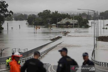 Petugas kepolisian dan pekerja konstruksi jalan berdiri dengan latar bangunan terendam banjir di pinggiran kota Windsor saat banjir yang melanda negara bagian New South Wales meluas ditambah cuaca buruk di Sydney, Australia, Senin (22/3/2021). ANTARA FOTO/REUTERS/Loren Elliott/wsj.