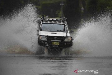 Sebuah kendaraan berjalan menembus banjir di Old Hawkesbury Road dekat Pitt Town dan Windsor, New South Wales, Australia, Senin (22/3/2021). ANTARA FOTO/AAP/Dean Lewins/via REUTERS/wsj.