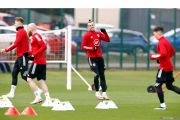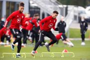 Pesepak bola Wales Hal Robson-Kanu (kanan) berlatih bersama-sama rekannya untuk persiapan menjelang pertandingan kualifikasi PIala Dunia FIFA 2022, di The Vale Resort, Hensol, Wales, Inggris, Selasa (23/3/2021). Wales akan menghadapi Belgia pada tanggal 25 Maret 2021 yang tergabung dalam group E Zona Eropa. ANTARA FOTO/Reuters-John Sibley/hp.