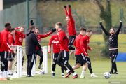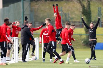 Pesepak bola Wales Gareth Bale (ketiga kanan) mengangkat kedua tangannya saat ia berlatih bersama-sama rekannya untuk persiapan menjelang pertandingan kualifikasi PIala Dunia FIFA 2022, di The Vale Resort, Hensol, Wales, Inggris, Selasa (23/3/2021). Wales akan menghadapi Belgia pada tanggal 25 Maret 2021 yang tergabung dalam group E Zona Eropa. ANTARA FOTO/Reuters-John Sibley/hp.