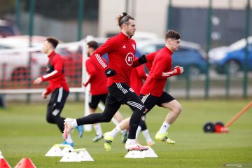 Pesepak bola Wales Gareth Bale (kedua kanan) berlatih bersama-sama rekannya untuk persiapan menjelang pertandingan kualifikasi PIala Dunia FIFA 2022, di The Vale Resort, Hensol, Wales, Inggris, Selasa (23/3/2021). Wales akan menghadapi Belgia pada tanggal 25 Maret 2021 yang tergabung dalam group E Zona Eropa. ANTARA FOTO/Reuters-John Sibley/hp.
