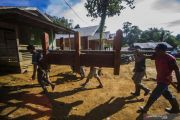 Sejumlah warga bergotong royong memikul rumah untuk dibawa ke makam saat Tradisi Membatur di Desa Ajung, Kabupaten Balangan, Kalimantan Selatan, Jumat (26/3/2021). Masyarakat Dayak Pitap menggelar tradisi tersebut untuk membuatkan rumah bagi orang yang telah meninggal dunia. ANTARA FOTO/Bayu Pratama S/wsj.