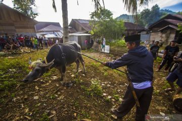 Seorang keluarga bersiap menombak kerbau saat Tradisi Membatur di Desa Ajung, Kabupaten Balangan, Kalimantan Selatan, Jumat (26/3/2021). Masyarakat Dayak Pitap menggelar tradisi tersebut untuk membuatkan rumah bagi orang yang telah meninggal dunia. ANTARA FOTO/Bayu Pratama S/wsj.
