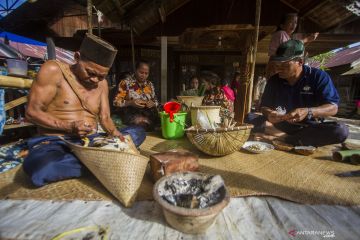 Sejumlah warga menyiapkan bahan makanan saat melakukan Tradisi Membatur di Desa Ajung, Kabupaten Balangan, Kalimantan Selatan, Jumat (26/3/2021). Masyarakat Dayak Pitap menggelar tradisi tersebut untuk membuatkan rumah bagi orang yang telah meninggal dunia. ANTARA FOTO/Bayu Pratama S/wsj.