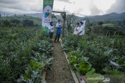 Petani milenial memeriksa kondisi tanaman brokoli di lahan pertanian desa Suntenjaya, Kabupaten Bandung Barat, Jawa Barat, Jumat (26/3/2021). Pemerintah Provinsi Jawa Barat meluncurkan program Petani Milenial yang mengusung konsep pertanian modern dengan teknologi yang dikelola oleh generasi muda sebagai upaya mengurangi angka pengangguran dan menahan laju urbanisasi dengan berbisnis di desa. ANTARA FOTO/Novrian Arbi/aww.