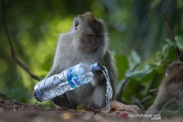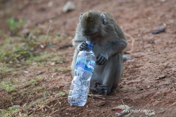Seekor monyet ekor panjang (Macaca fascicularis) membawa sampah air minum dalam kemasan yang dilemparkan warga di kawasan Suaka Margasatwa Muara Angke di Kapuk Muara, Penjaringan, Jakarta, Jumat (26/3/2021). Menurut Balai Konservasi Sumber Daya Alam (BKSDA) DKI Jakarta, sampah yang mencemari lingkungan berdampak kepada perilaku monyet ekor panjang setempat karena lebih memilih makan di luar wilayah margasatwa. ANTARA FOTO/Aditya Pradana Putra/aww.